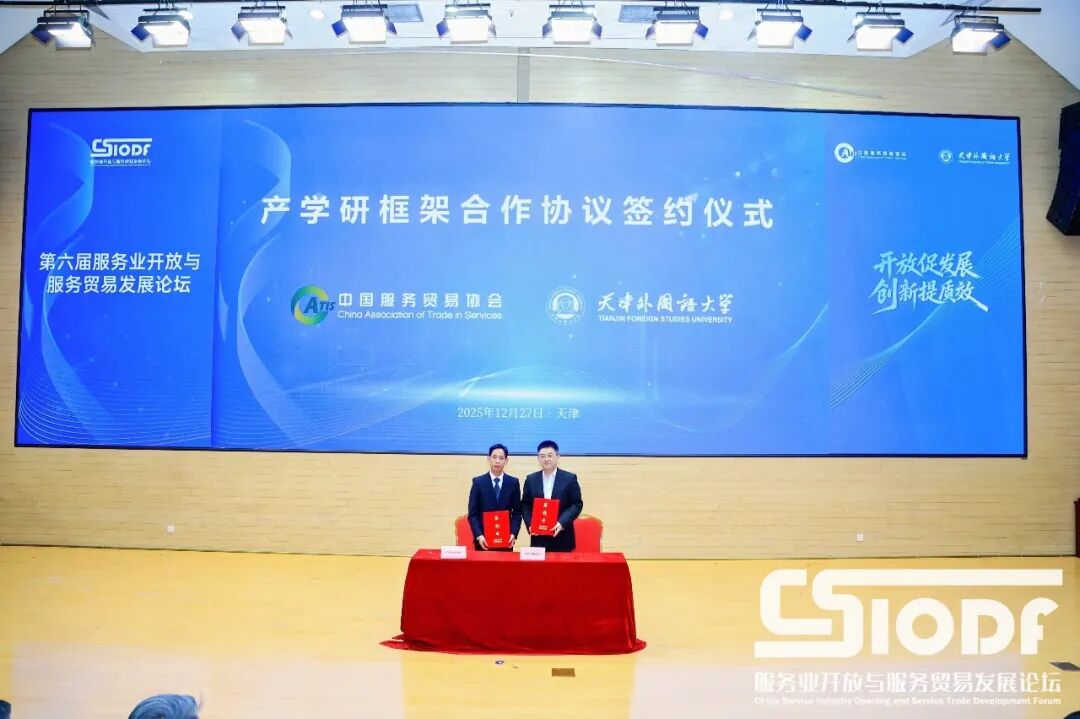 开幕论坛期间中国服务贸易协会与天津外国语大学签订产学研框架合作协议,未来双方将发挥各自优势,从科学研究、标准制定、服务贸易和数字商务人才培养基地建设、举办语言服务创新创业大赛、国际合作等多维度开展深入合作。